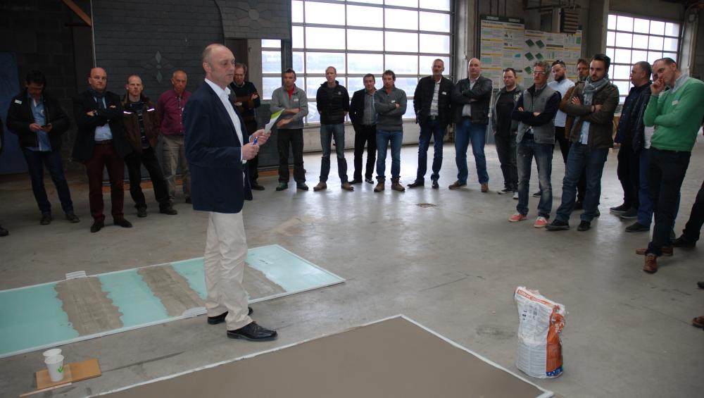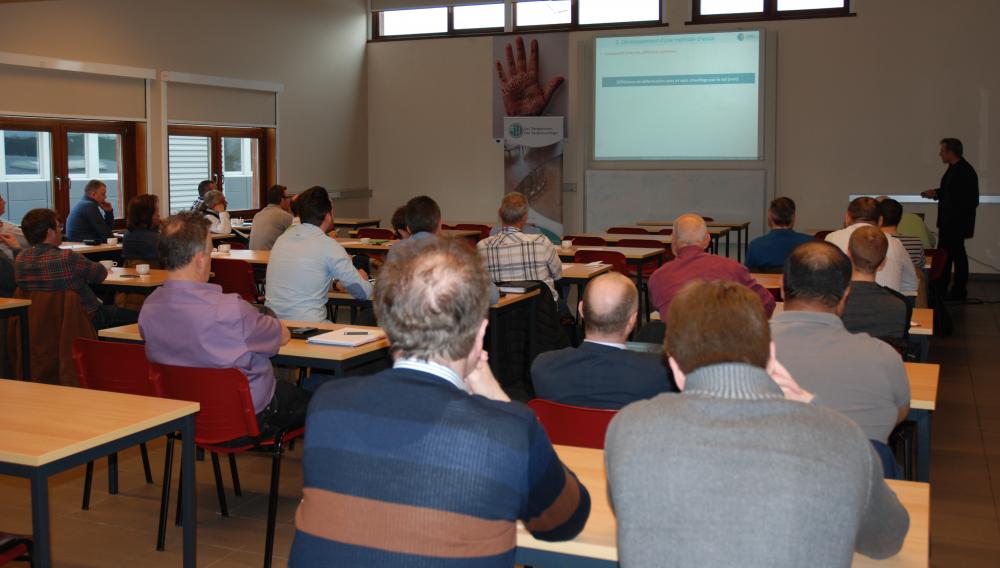 Mr Charron, chef de laboratoire au CSTC, a débuté cette journée d’étude avec sa présentation des résultats des essais sur les systèmes de chauffage par le sol par contact direct avec les revêtements en bois. S’en sont suivis les exposés des firmes Rubio Monocoat, V33/Plastor, Blanchon, Unipro et Mapei.